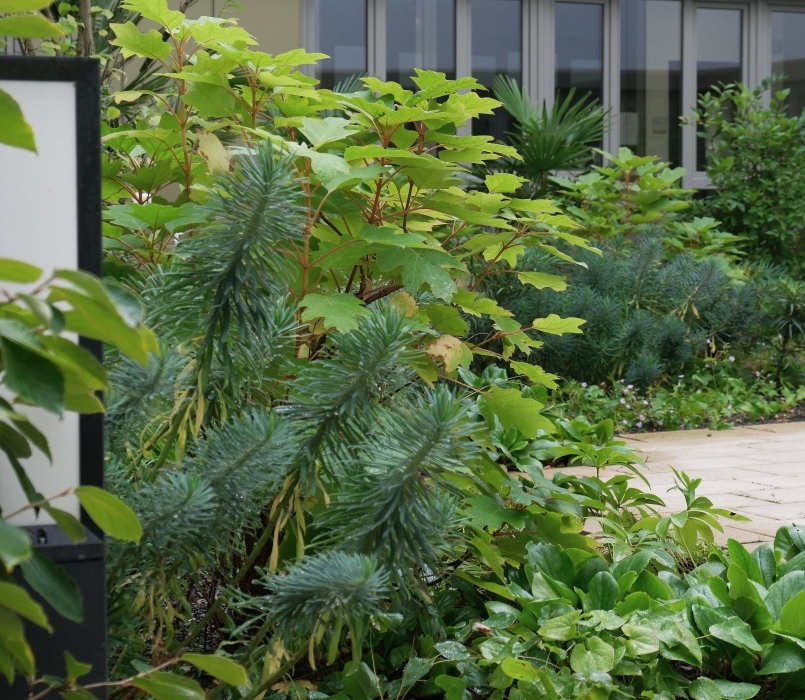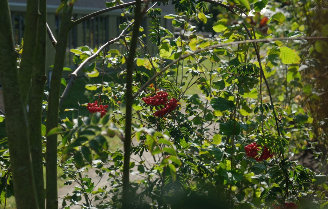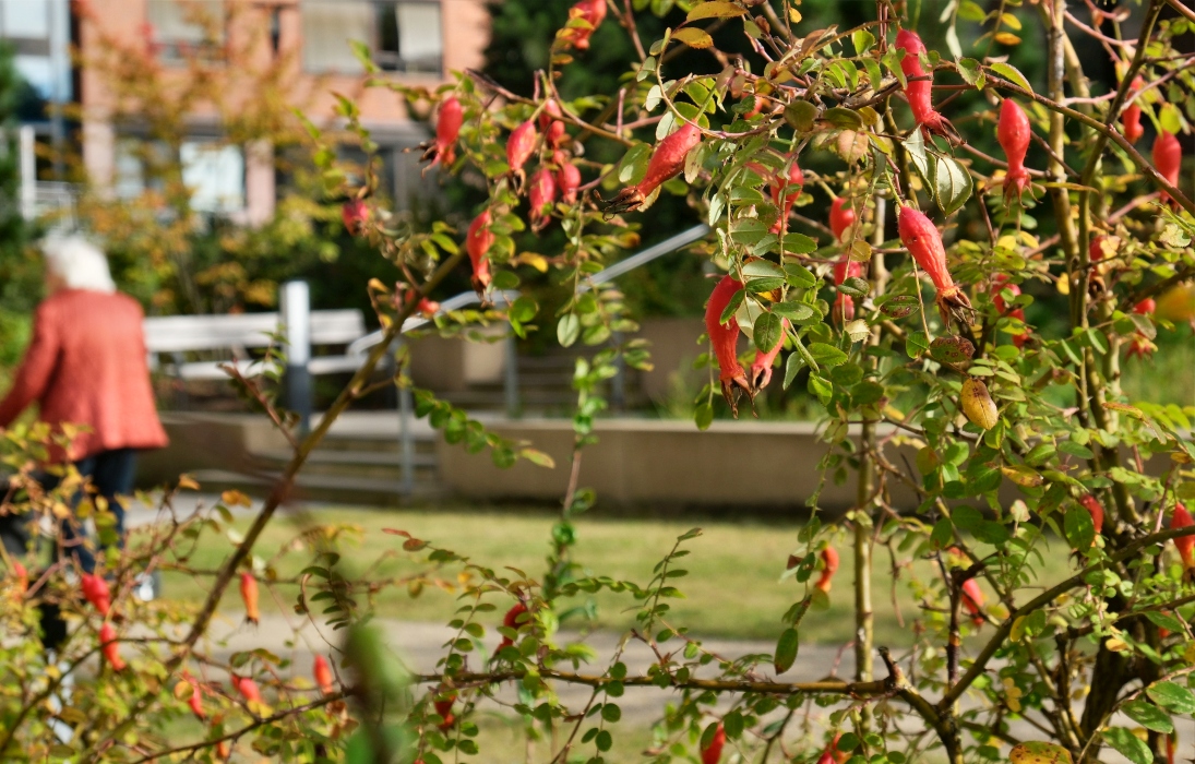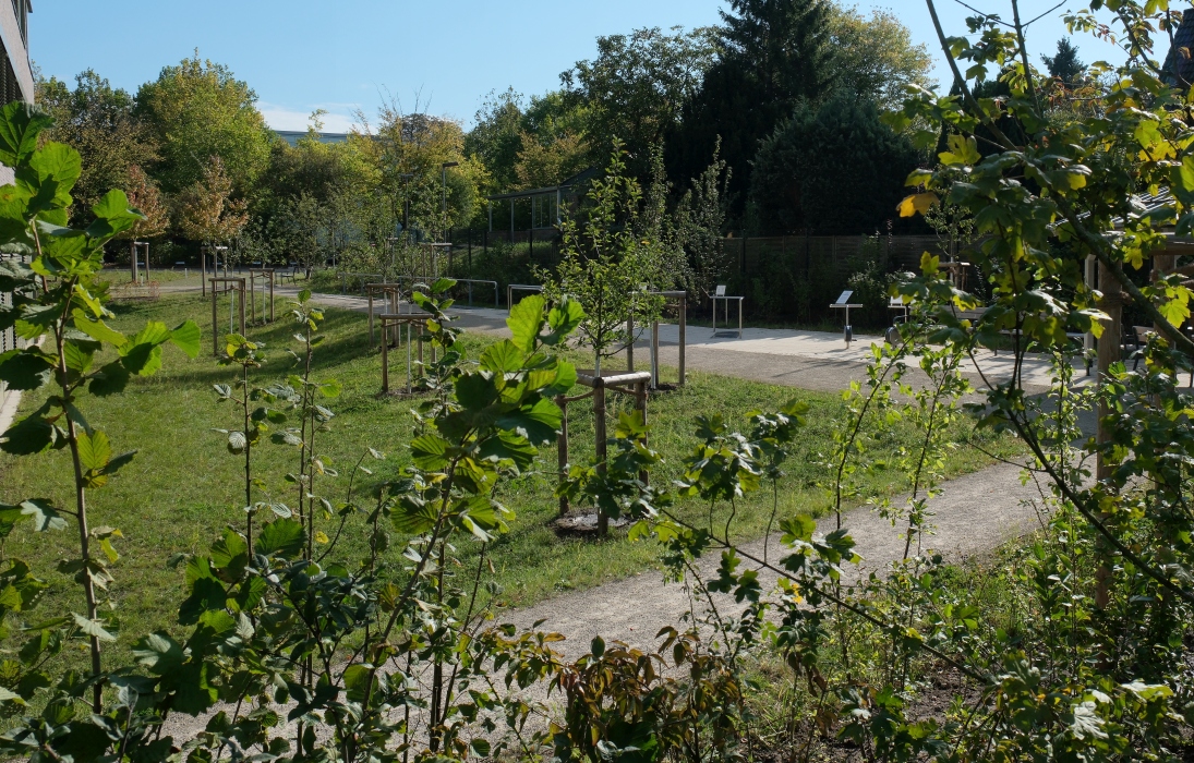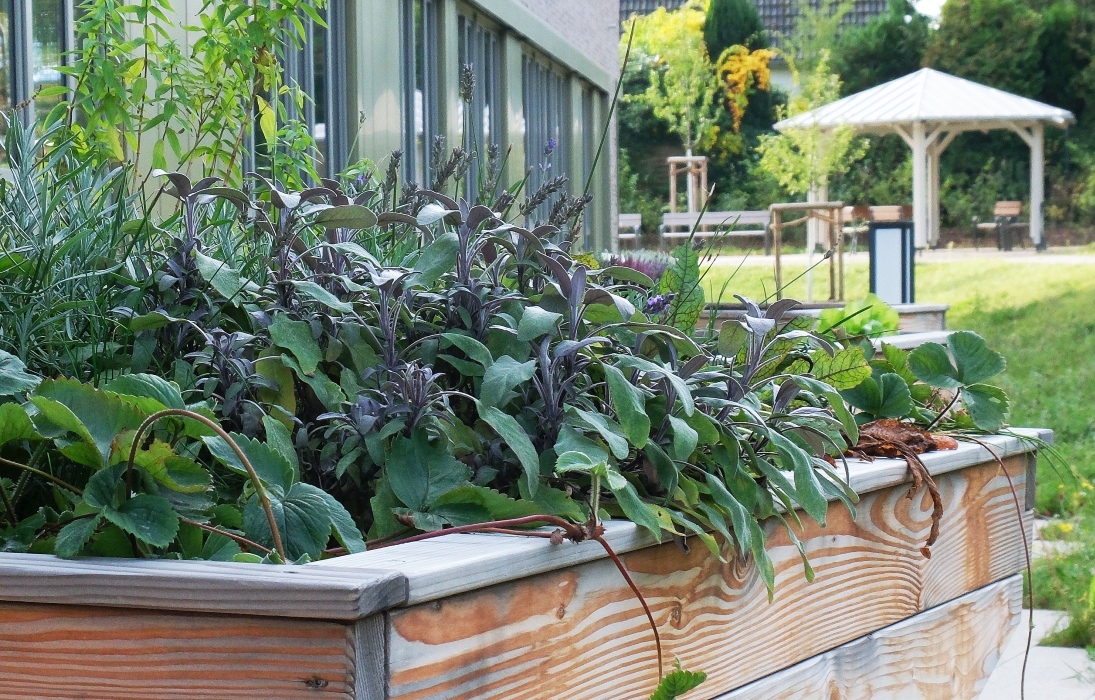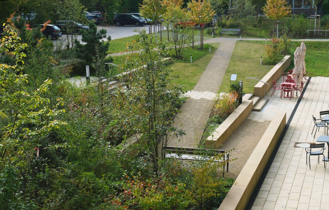 Wichtig war uns aber auch, dass sich vertraute Elemente in den Freianlagen wiederfinden, Elemente die man aus dem eigenen Garten kennt. So gibt es Möglichkeiten an rollstuhlgerechten Hochbeeten zu gärtnern und Kräuter zu ziehen, Obst zu ernten oder Nüsse zu sammeln. Naturnahe, blumenreiche Wiesenflächen ziehen Bienen und Schmetterlinge an und selbst Patientinnen und Patienten, die das Gebäude nicht mehr verlassen können, haben die Möglichkeit, aus den Betten oder überdachten Loggien heraus, das bunte Treiben in der neuen Vogelschutzhecke zu beobachten. Hier wurde eine große Vielfalt an heimischen Vogelnist- und -nährgehölzen gepflanzt, die schon nach kurzer Zeit von zahlreichen Vogelarten besucht wird.