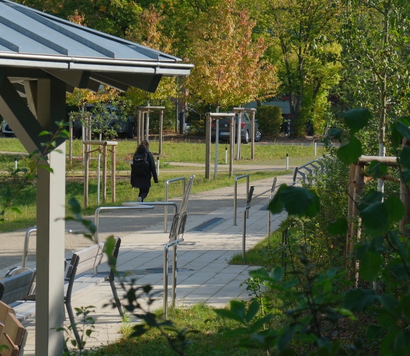 Ergänzt werden die Freianlagen durch einen einladenden Vorplatz mit einer Vorfahrt für Hol- und Bringdienste sowie überdachten Personal-Fahrradstellplätzen.