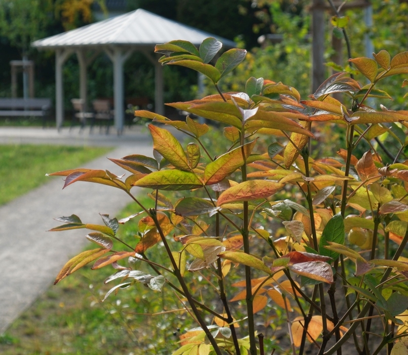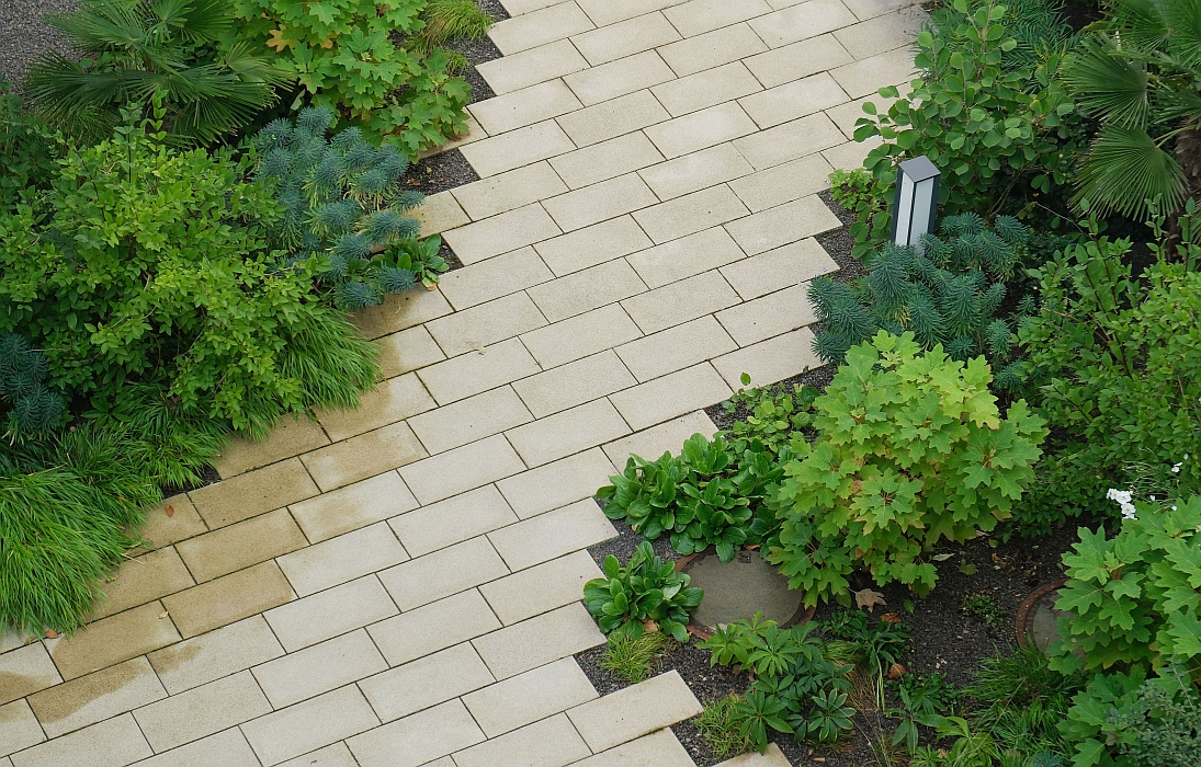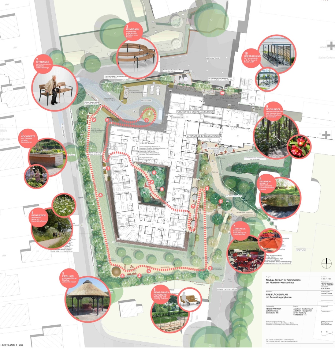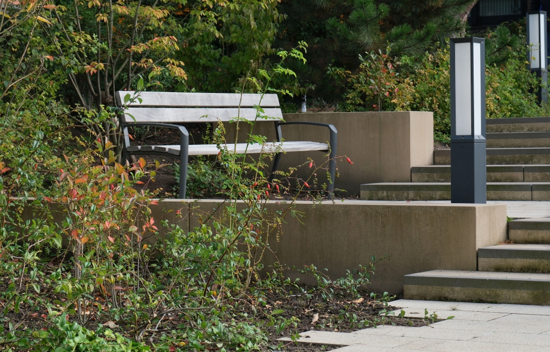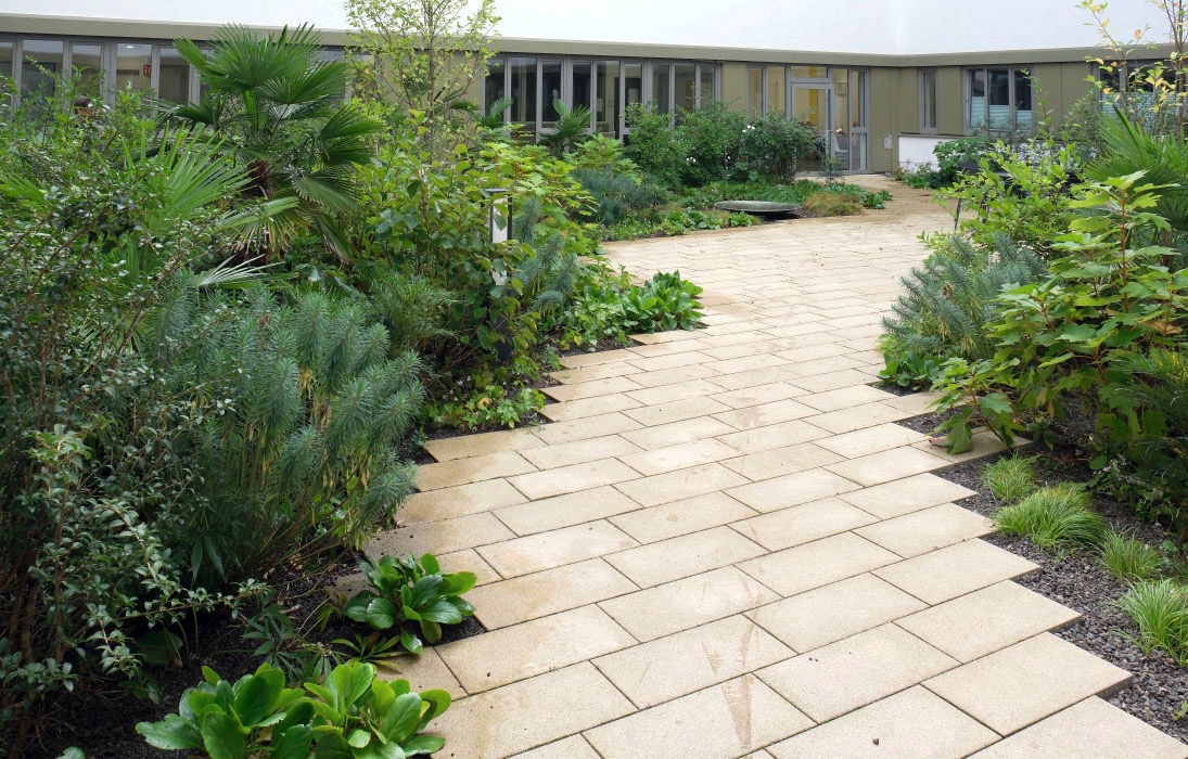 Die Bedürfnisse und Einschränkungen hochbetagter Personen waren die Grundlage für alle folgenden Überlegungen. Sämtliche Bereiche sind selbsverständlich barrierefrei gestaltet, gleichzeitig gibt es daneben aber auch immer wieder kleine Herausforderungen – kurze Treppenläufe, unebene Wegefächen mit unterschiedlichsten Materialien – die helfen, die Motorik im Alltag zu schulen. Ergänzt werden die Angebote durch einen Therapiegarten, in dem die Patientinnen und Patienten eigenständig oder unter Anleitung Kraft- und Mobilität trainieren können. Eine helle, freundliche Farbgebung der Wegeoberflächen unterscheidetet die Gehewege von den dunkel gehaltenen Flächen für Fahrzeuge und erleichtert dadurch die Orientierung. Einbauten entlang der Wege wurden in kontrastierenden, dunklen Farbtönen ausgewählt, um sie auch für seheingeschränkte Personen besser erkennbar zu machen.