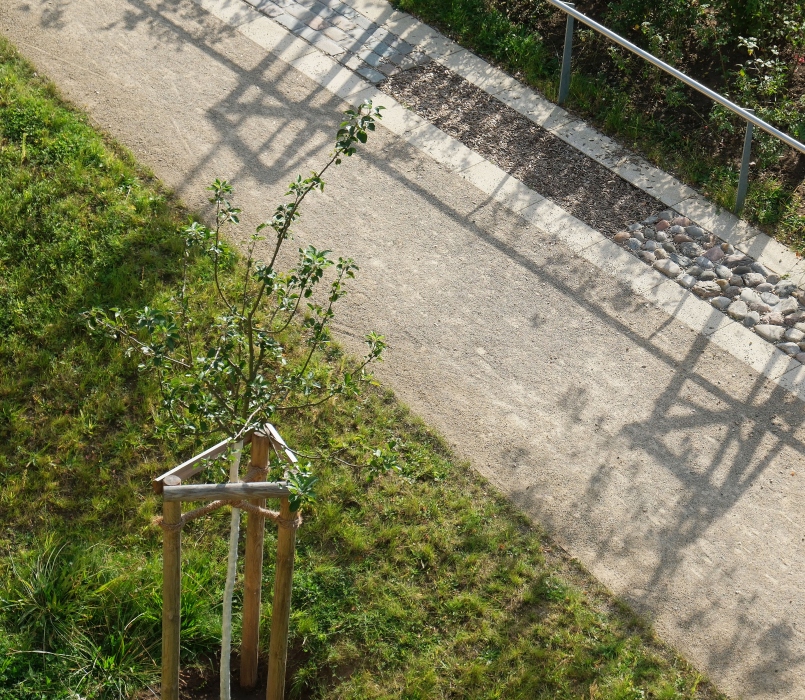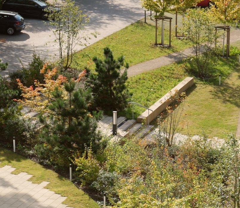 Eine Herausforderung bei der Gestaltung der Freianlagen war der Situation geschuldet, dass das Erdgeschoss ca. 2 m unter den angrenzenden Geländeflächen geplant war. Durch umfangreiche Erdbewegungen, den Bau von Sitzmauern, Treppen und Rampenanlagen war es möglich ein freundliches, einladendes Umfeld zu entwerfen, bei dem zu keiner Zeit ein „Souterrain-Gefühl“ aufkommt.