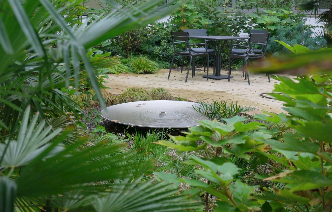 Ein besonderes Highlight bildet der ruhige, introvertierte Innenhof im Zentrum des Erdgeschosses. Umgeben von üppiger, fast tropisch anmutender Vegetation können Patientinnen und Patienten mal kurz „an die frische Luft“ und beim leisen Plätschern eines kleinen Brunnen entspannen. Eine grüne Ruheinsel inmitten des Klinikalltags.