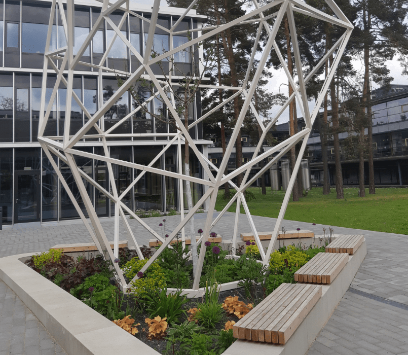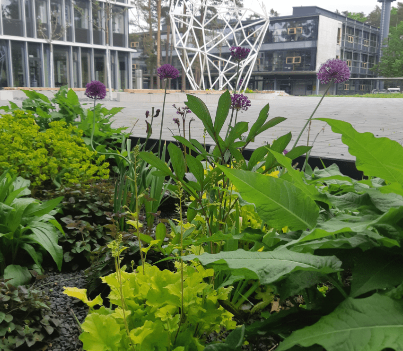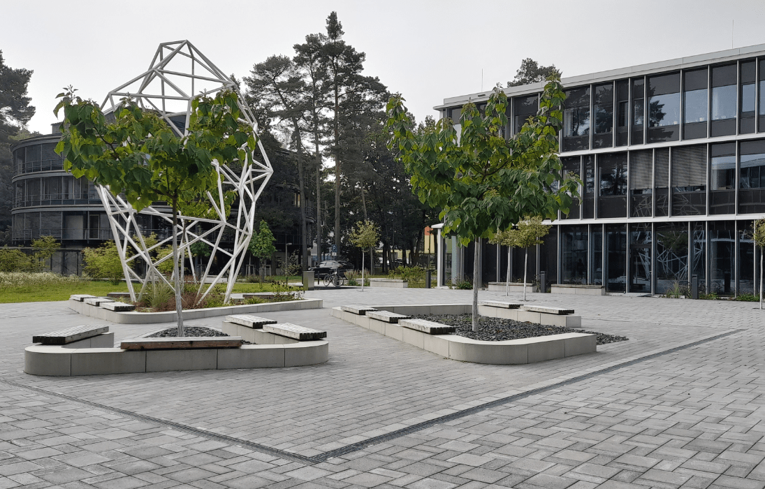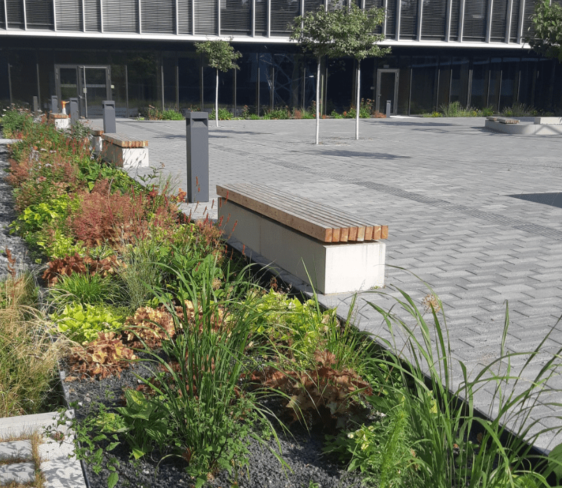Gesäumt wird der Platz von einem Blütenband entlang des Gebäudes, welches ganzjährig verschiedene Blütenaspekte hervorbringt und durch die Glasfassaden von außen und innen gleichermaßen erlebbar ist.
